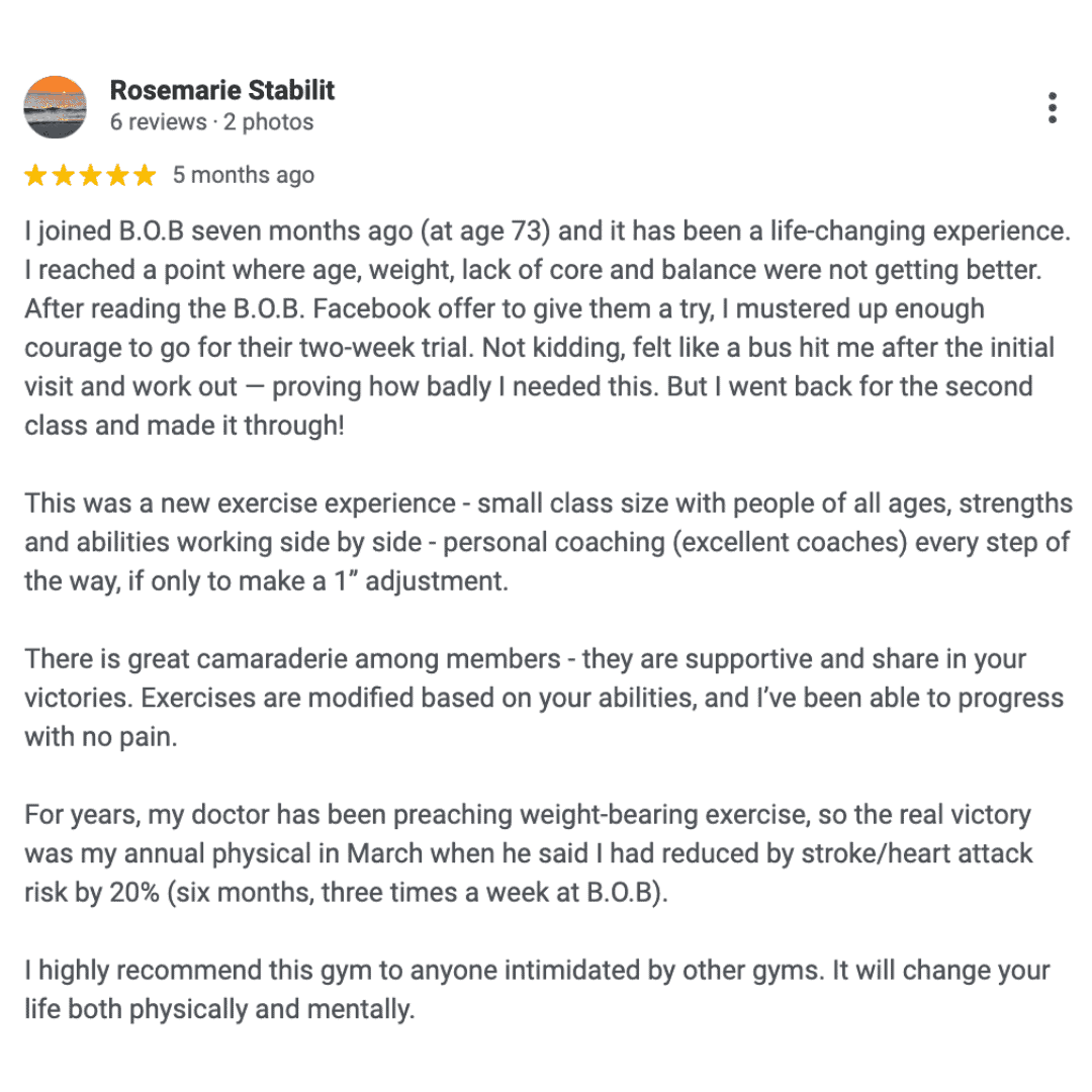 I joined B.O.B seven months ago (at age 73) and it has been a life-changing experience.