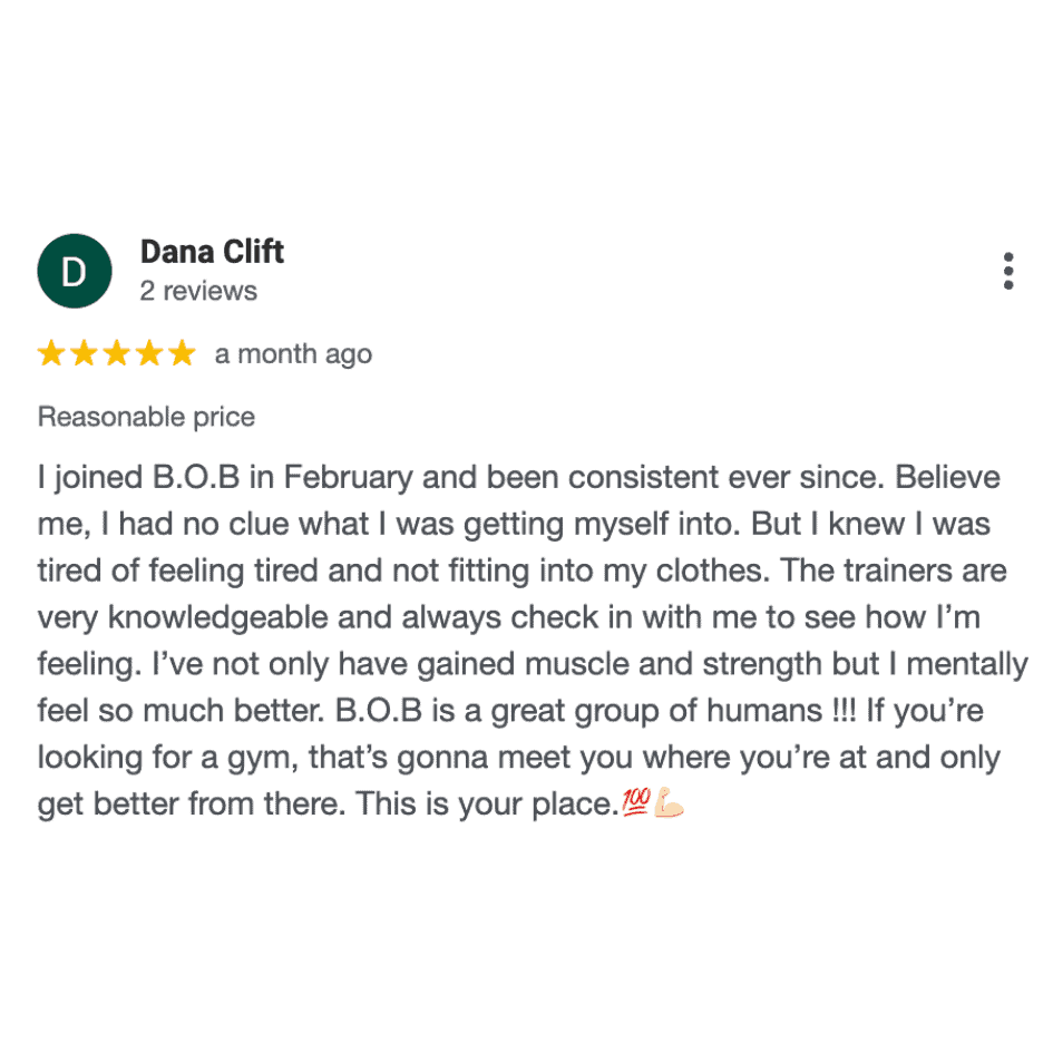 I’ve not only have gained muscle and strength but I mentally feel so much better. BOB is a great group of humans!!!