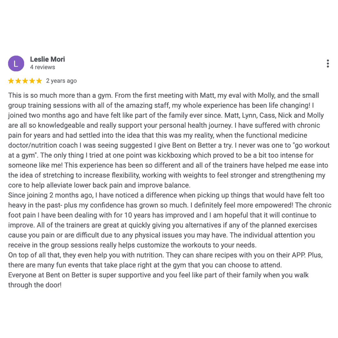 Everyone at Bent on Better is super supportive and you feel like part of their family when you walk through the door!