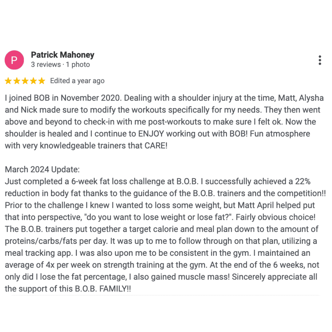 I successfully achieved a 22% reduction in body fat thanks to the guidance of the B.O.B. trainers and the competition!!
