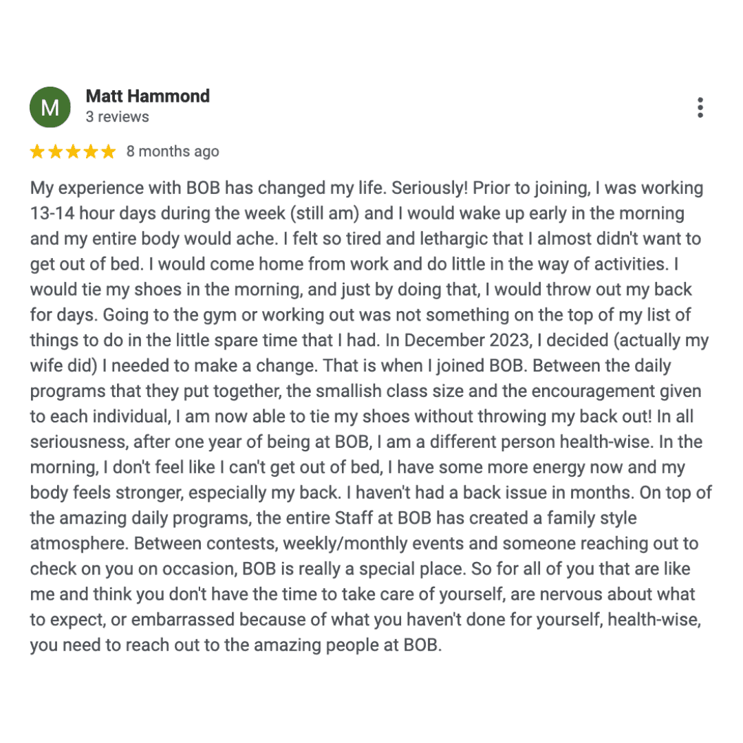 after one year of being at BOB, I am a different person health-wise. I have more energy now and my body feels stronger.