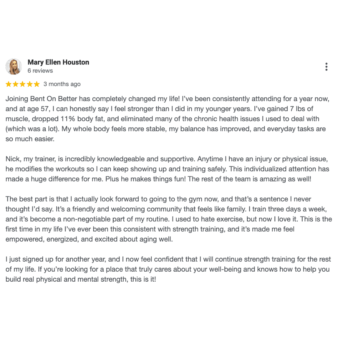 Joining Bent On Better has completely changed my life! I’ve been consistently attending for a year now, and at age 57, I can honestly say I feel stronger than I did in my younger years.