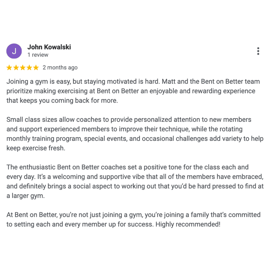 Matt and the Bent on Better team prioritize making exercising at Bent on Better an enjoyable and rewarding experience that keeps you coming back for more.